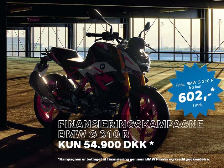 *Ovenstående tilbud betinger sig af at motorcyklen finansieres ved igennem BMW Finans. Eksempel på finansiering: BMW G 310 R.
