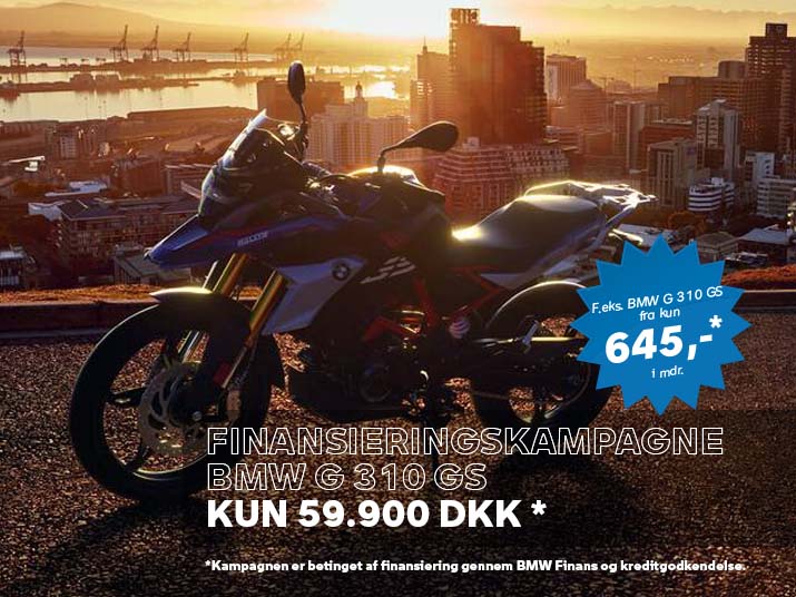 *Ovenstående tilbud betinger sig af at motorcyklen finansieres ved igennem BMW Finans. Eksempel på finansiering: BMW G 310 GS.