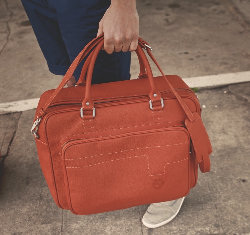 Denne stilfulde rejsetaske er en del af BMW motorrads eksklusive 40 års jubilæumskollektion. Tasken er lavet af italiensk læder med dekorative detaljer. Den har lædergreb og skulderrem, en udvendig lomme samt bundknapper. Denne orange/rød opgave fås i et begrænset antal på 200 stk.