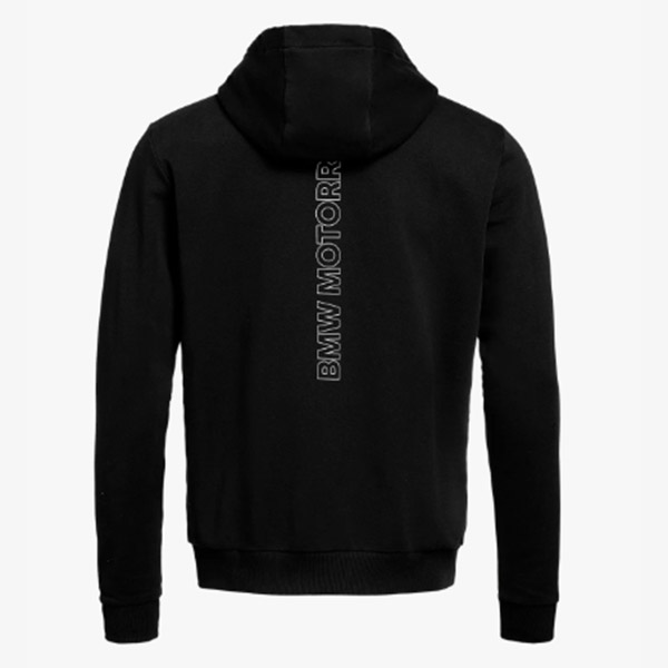 Behagelig hættetrøje med lynlås med BMW-logo på brystet og BMW Motorrad-inskription på ryggen.