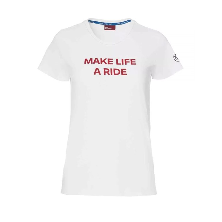 Flot t-shirt i hvid fra BMW Motorrad til kvinder. Dame t-shirten går ind i taljen og har ”Make life a ride” stående på forsiden med rød skrift. På ærmet er der et klassisk BMW logo i sort. T-shirten er lavet i 100% økologisk bomuld.