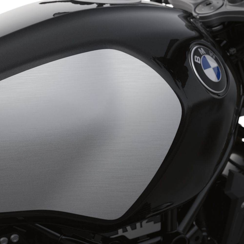 Forhjulsdæksel, airboxdæksel, motorcykelsæde: farven sort løber igennem og tager R 12 nineT til næste niveau cool. Tanken i sort med aluminiumslook sætter en spændende accent.
