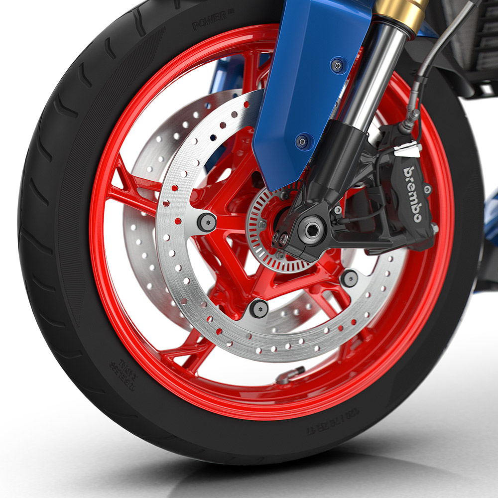 Tag de tre farver, der er uløseligt forbundet med motorsport på længere ture, i stedet for til racerbanen. De røde fælge understreger den dynamiske karakter.