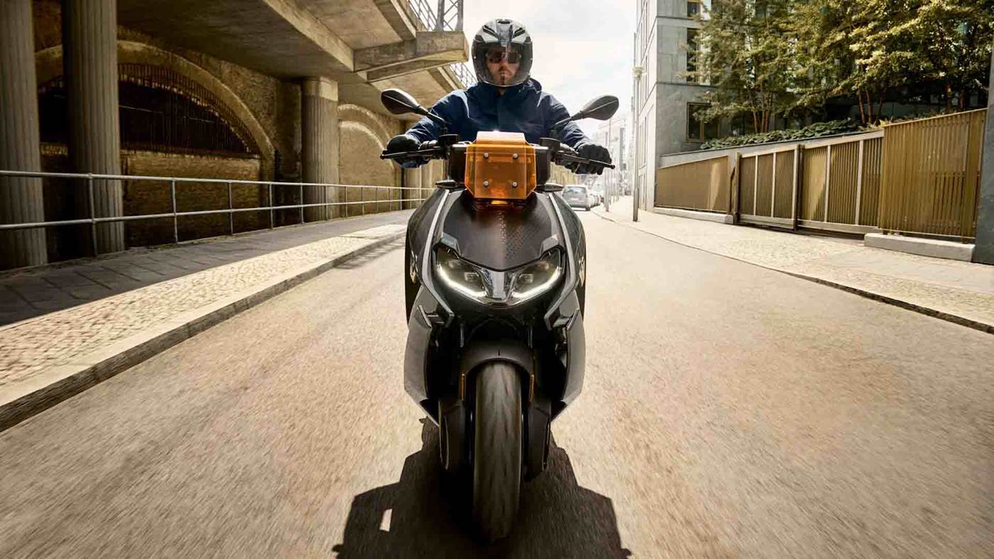 Den stilige avantgarde BMW CE 04 i magellan-grå metallic blander sig problemfrit ind i byens atmosfære på en udtryksfuld og selvsikker.