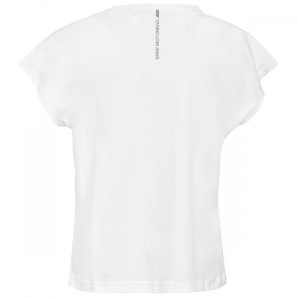 BMW Motorrad t-shirt til damer i hvid. På fronten har t-shirten et stort hologram logo, der nuancerer i farven når lyset falder ind på. T-shirten er lavet i 100% bomuld og har en rund krave.