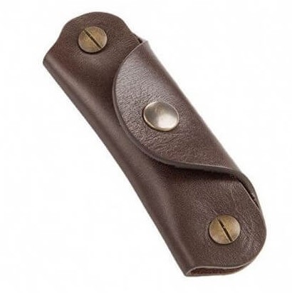 Praktisk nøglering med lukkeknap. Prægede indskrift. 100% læder. Mørkebrun farve .