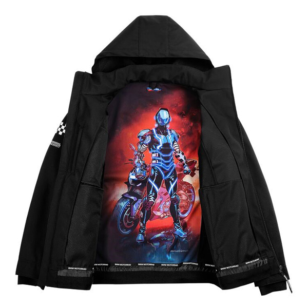- Stort Motorsport-print på venstre side af brystet, inklusive med BMW Motorrad Motorsport-inskription, "Racing like no other"-inskription og RR-badge.