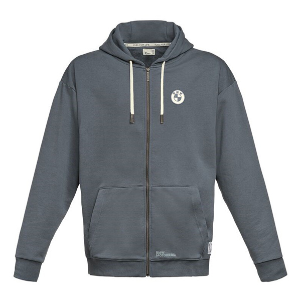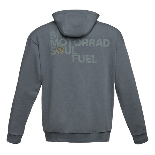 Klassisk hættetrøjetrøje med lynlås og stor "BMW Motorrad Soulfuel"-inskription over ryggen.