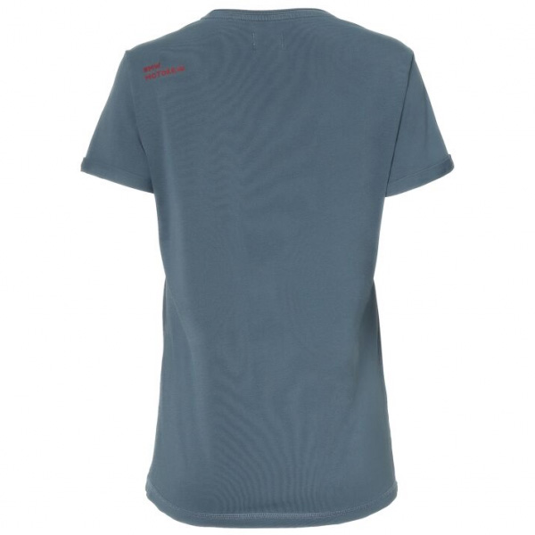 T-shirt til kvinder fra fra BMW Motorrad. Dame t-shirten er blå og har en rund halsudskæring. På brystet står der ”Soulfuel”. På bagsiden er der skrevet ”Make like a ride” oppe ved venstre skulder.