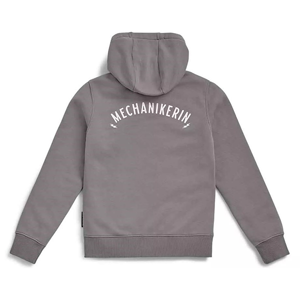 På kolde dage holder hættetrøjen med lynlås dig behageligt varm, og takket være lommerne på maven giver den også plads til kolde hænder. Den alsidige sweatshirt i bomuldsjersey er ru på indersiden og har et boksermotortryk på brystet og "Mechaniker" bogstaver på bagsiden.